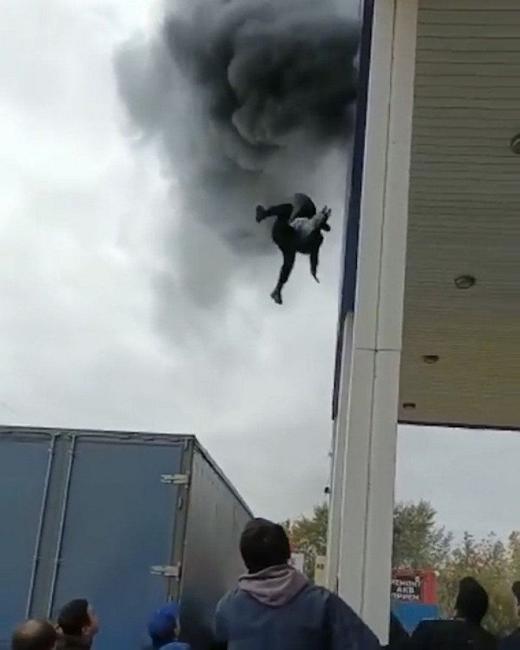 Очевидцы прислали видео в редакцию, на кадрах которого видно, что находившаяся на верхнем этаже девушка решилась спастись от дыма, заполонившего весь торговый центр.