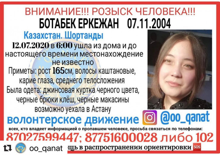 Полицейские просят всех, кто знает что-либо о Еркежан, сообщать по номерам, указанным в листовке.