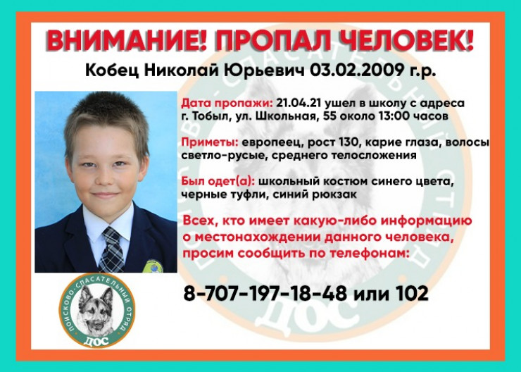 21 апреля в городе Тобыл пропал 11-летний Николай Кобец, сообщает пресс-служба ДП Костанайской области, передает Tengrinews.kz.