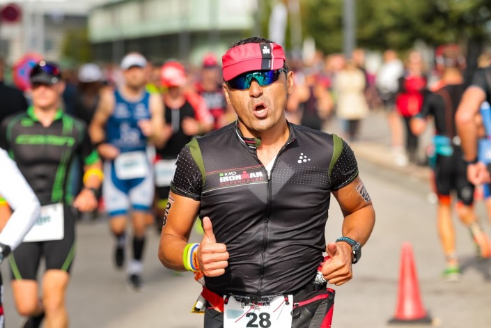 "Все было против меня. (...) За несколько часов до старта решили выступить, т.к. регистрация на ближайшие старты была уже закрыта, но уже не претендуя на хороший результат... И как следствие уже на плавании, без внимания, заплутал пару раз с маленькими группами участников, проплыл лишние 400 метров... т.е. 4 километра 230 метров... Потерял около 8 драгоценных минут! На вело в целом выдержал темп с неудобной посадкой, а руль разболтался (ночная сборка в коридоре отеля), рискуя в дождь на поворотах, доехал на последнем слове... соревнуясь с другими гонщиками, 180 километров.., а на марафоне разозлился вконец, взял высокий темп всем чертям на зло... около 5.05 и практически пронесся 34 километра, когда предательски схватили ноги судороги... и руки!.. про такое я вообще не слышал, руки скрутило... остановки, не слушавшимися пальцами принимаю аспаркам, кальций, соль каждые 2 км, через боль, как на ходулях, сбавил, но добежал!.. Счастье на финише!!! Все! Сносный результат, я подумал, фото на память, медаль... забрали велосипед и пошли усталые сквозь толпы болельщиков в отель в 18.00 вечера", - добавил он.