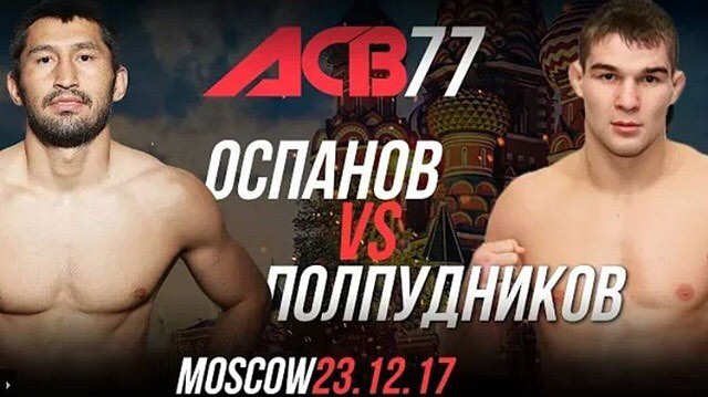 Турнир ACB 77 пройдет 23 декабря. Бой Оспанов - Полпудников состоится уже в ночь на 23 декабря, ориентировочное начало - в 01.00 по времени Астаны. Бойцы уже встречались друг с другом в 2013 году на турнире в Сочи. Тогда казахстанец победил нокаутом на 58-й секунде.