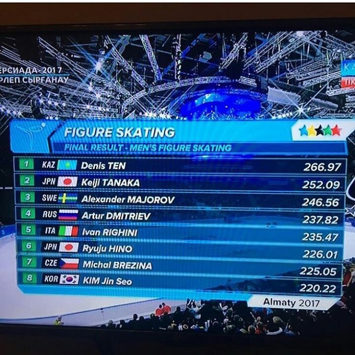 Денис Тен лидировал по итогам короткой программы с результатом 94,91 балла. За произвольную судьи выставили казахстанцу 172,06 балла. По сумме двух программ Тен набрал 266,97 балла и занял первое место.