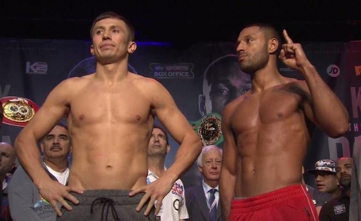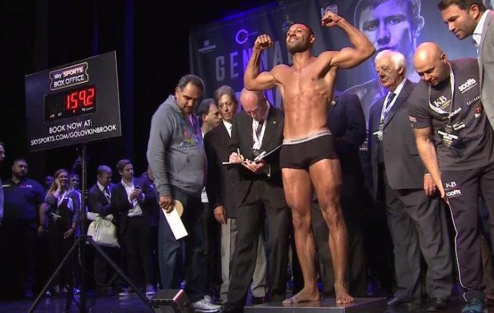 Казахстанец Геннадий Головкин оказался легче Келла Брука на взвешивании перед боем, сообщают Vesti.kz. По итогам церемонии взвешивания вес Головкина составил 158,9 фунтов (72 килограмма 158 граммов), а его оппонента, британского боксера Келла Брука, - 159,4 фунта (72 килограмма 302 грамма).