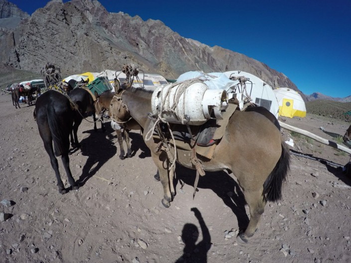 "Упаковываем баулы. Мы наняли двух мулов, чтобы транспортировать 120 килограммов груза. У нас на троих наберется от силы лишь 90 килограммов. Мулы потащат наш экспедиционный груз сразу в "Плаза де Мулас", мы же сегодня пойдем в промежуточный лагерь "Конфлюэнция". Опа! У нас перевес - 133 килограмма. Платить по четыре доллара за каждый килограмм перегруза мы не стали. Решили избавиться от пяти бутылок Coca-Cola. Уложились в лимит. Получили мусорные пакеты. Теперь на пикапе до входа в парк. Оттуда пешком до лагеря. Следующий выход на связь будет оттуда", - рассказал Жумаев.
