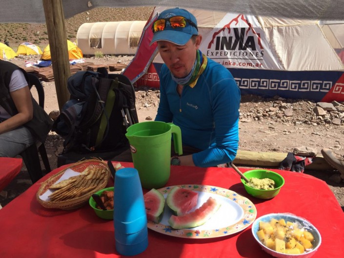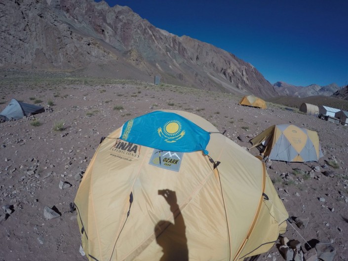 "По приходу нас обрадовали арбузом. Затем у нас была битва за спутник, буквально уже 10 минут, как на нас снизошло "грандиозо траффико". Приятен был комплимент от компании "Инка" в виде бутылочки красненького вина. Что делать с ним? Отказываться негостеприимно, выпить... все равно что продукт переводить. Так вот! Как вы, наверное, отметили, с утра мы стартанули из Мендосы на машине в Пенитентос. Как оказалось, это горнолыжный курорт, по работающим "канаткам" поняли, что курорт круглогодичный. По пути останавливались в красивых местах, фотографировались. Отметили для себя высокий уровень местного туризма. Повсюду аргентинцы ходят, кучками, толпами, стайками. Шумные и веселые. До лагеря "Конфлюэнция" дошли спокойно, за два часа с копейками. Нас накормили и определили по палаткам. Перед ужином было несколько часов, и мы их потратили на поиск связи и отладки спутниковой аппаратуры", - рассказал Магжан Сагимбаев.