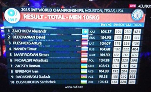 В рывке наш атлет сумел поднять снаряд весом 191 килограмм, а в толчке - 230 килограммов. По сумме двух упражнений Зайчиков набрал 421 килограмм и вышел на первое место.