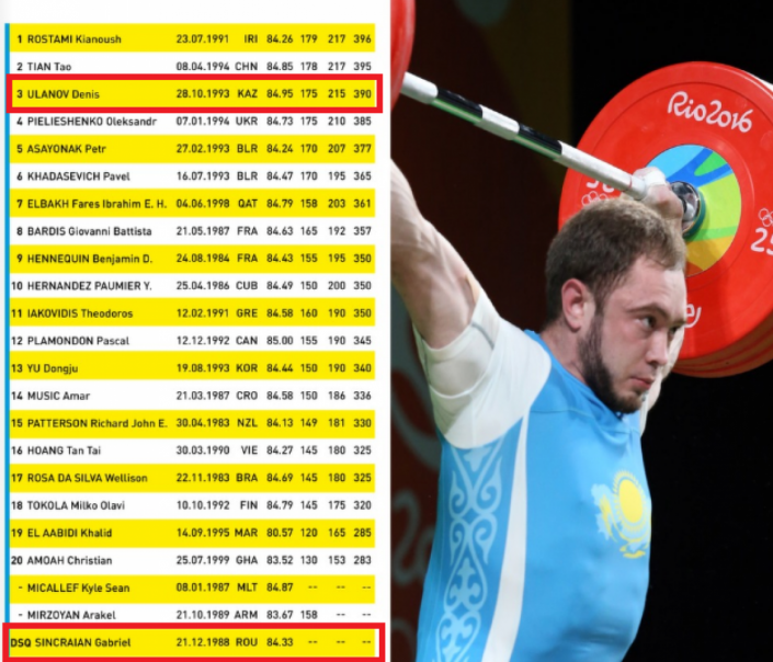 Напомним, казахстанский тяжелоатлет Денис Уланов с результатом 390 килограммов занял четвертое место в весовой категории до 85 килограммов на Олимпиаде в Рио-де-Жанейро. Бронзовый медалист румын Габриэль Синкраян показал точно такой же результат, но из-за более легкого веса опередил казахстанца. Чемпионом в этом весе стал иранец Киануш Ростами - 396 килограммов (179+217), обновивший собственный мировой рекорд в толчке и в сумме. Второе место занял китаец Тянь Тао - 395 килограммов (178+217).