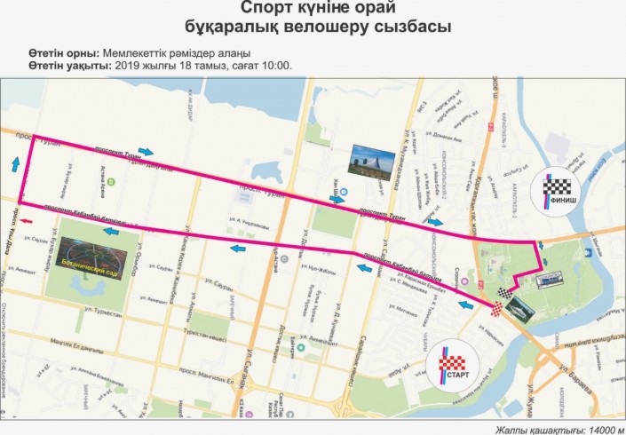 Участникам велопробега предстоит преодолеть дистанцию в 14 километров по проспекту Кабанбай батыра от Дворца "Салтанат Сарайы" до улицы Улы Дала, далее по проспекту Туран до Центрального парка. Регистрация начнется в 08.30, старт – в 10.00.