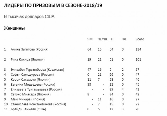 Турсынбаева по призовым в сезоне 2018/2019 вошла в тройку лидеров, уступив по доходам лишь россиянке Алине Загитовой и японке Рике Кихире.