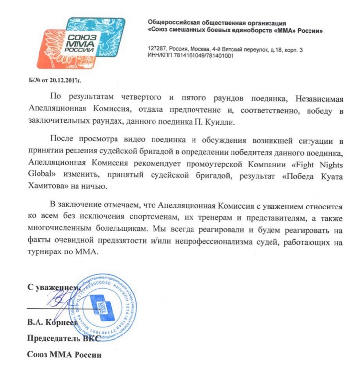 "Независимая апелляционая комиссия Союза ММА России изменила результат боя между Куатом Хамитовым и Питером Куилли. Напомним, по итогам пятираундового рейтингового боя, состоявшегося 26 ноября в Алматы, судейская бригада признала победителем противостояния бойца из Казахстана. По итогам рассмотрения протеста, поданного командой Куилли, независимая комиссия изменила исход боя на ничейный результат", - говорится в сообщении, опубликованном на странице промоушена в Instagram.