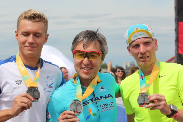 Генеральный менеджер велокоманды "Астана", олимпийский чемпион Александр Винокуров регулярно участвует в соревнованиях по триатлону. Он отметил, что заканчивал гонку без сил и "бежал на характере".