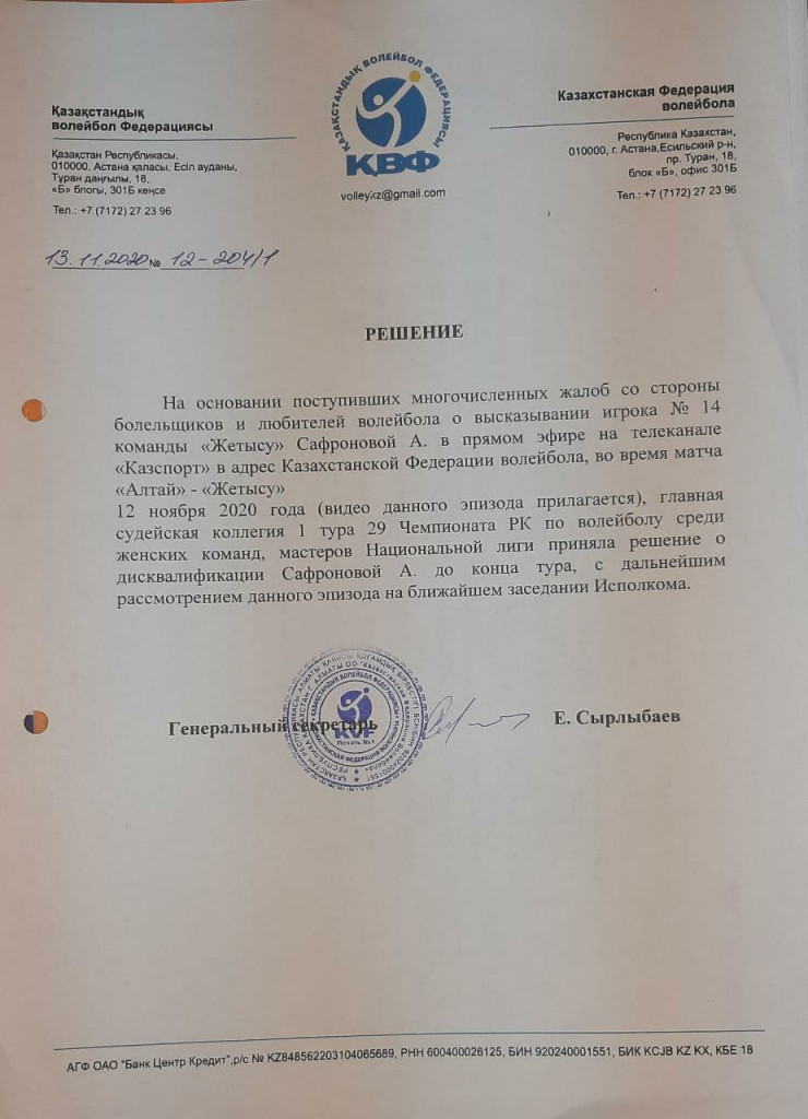 12 ноября 2020 года главная судейская коллегия первого тура 29-го чемпионата по волейболу среди женских команд, мастеров национальной лиги приняла решение о дисквалификации Алеси Сафроновой до конца тура с дальнейшим рассмотрением данного эпизода на ближайшем заседании исполкома", - сообщил генеральный секретарь федерации Ермек Сырлыбаев.