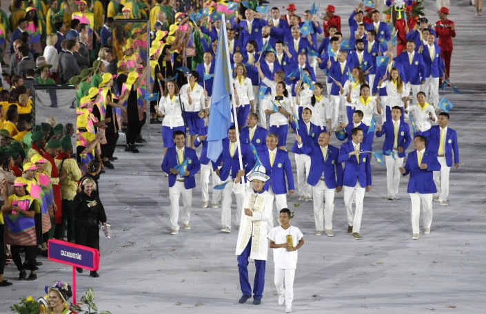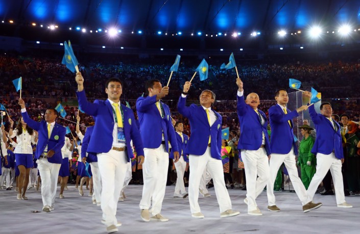 Первой вышла сборная Греции как страны, основавшей Олимпийские игры. Далее команды выходили в алфавитном порядке. Флаг Казахстана на церемонии нес таеквондист Руслан Жаппаров. Завершила парад на правах хозяев команда Бразилии.