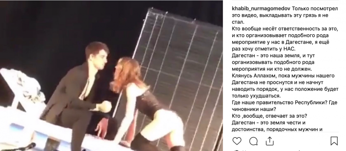 "Почему власть Дагестана молчит? Почему все молчат и поддакивают этой порнухе в центре города, или вы хотите, чтобы люди вышли на улицу? Не надо нас провоцировать и унижать, всему есть предел. Скажите мне, закон нашей страны одобряет спектакль, где голые мужчины и женщины целуются в центре города? Мой совет правительству Дагестана, чтобы провели расследование и организаторы понесли наказание по закону и извинились перед народом, и чтобы впредь больше такого не повторилось, чтобы мероприятия такого рода контролировались на уровне министерств и правительства республики. И хочу обратиться к правительству Дагестана, если вы думаете, что все закончится на постах в соцсетях, то вы ошибаетесь, примите меры вовремя", - написал Нурмагомедов в новой публикации.