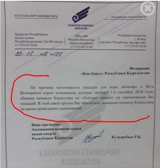 Желідегі сынның бір сыпырасы көкпаршылардың атсыз барғаны жайында болды. Сөйтсек, Қазақстанның Ұлттық спорт қауымдастығы турнир қарсаңында Қырғызстанның "Көкбөрі" федерациясына атпен қамтамасыз ету туралы өтініш жолдаған екен.