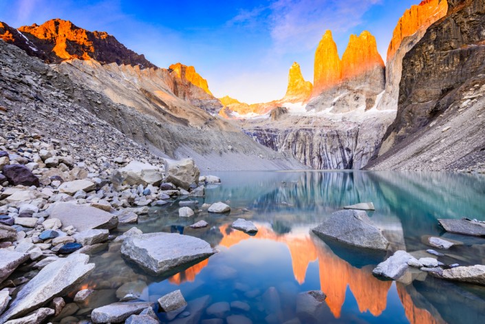 Торрес дель Пайне, Чили. Национальный парк Торрес-дель-Пайне относится к красивейшим паркам Южной Америки. Он расположен на юге страны в чилийской Патагонии и занимает площадь в 2 422 гектара. На территории парка собраны практически все ландшафты, это и патагонская степь, и магеллановы субполярные леса, андская пустыня, горные массивы, многочисленные озера и реки.  Природный парк охватывает огромную территорию с множеством гор, например, пики Серро-Пейн-Гранде и Куэрно-Принсипа, озера Норденшельд, Пеоэ, Сармиенто и Серое озеро, водопад Сальто-Гранде, ледники и фьорды. Одна из главных достопримечательностей - Серый ледник. Посетители парка могут совершить однодневные экскурсии на машине или поучаствовать в походе, который занимает по времени от 4 до 8 дней. В парке есть разветвленная сеть тропинок, удобные подъезды к озерам и ледникам, а также большое количество смотровых площадок.