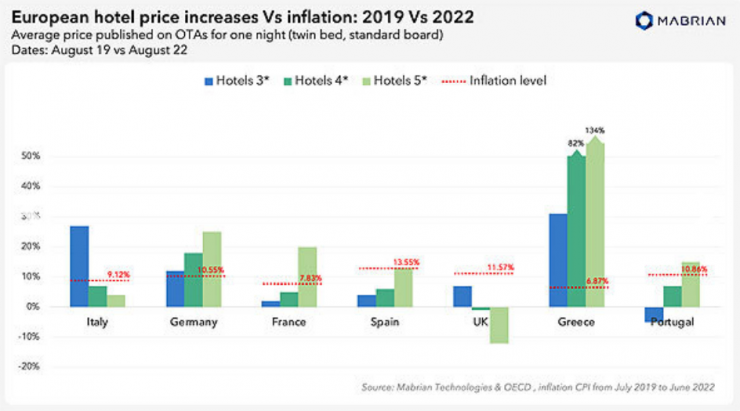 Mabrian, ведущая туристическая аналитическая компания, проанализировала цены на отели в основных европейских странах в августе и сопоставила их с местными уровнями инфляции, сравнив данные за 2022 год с данными за 2019 год.