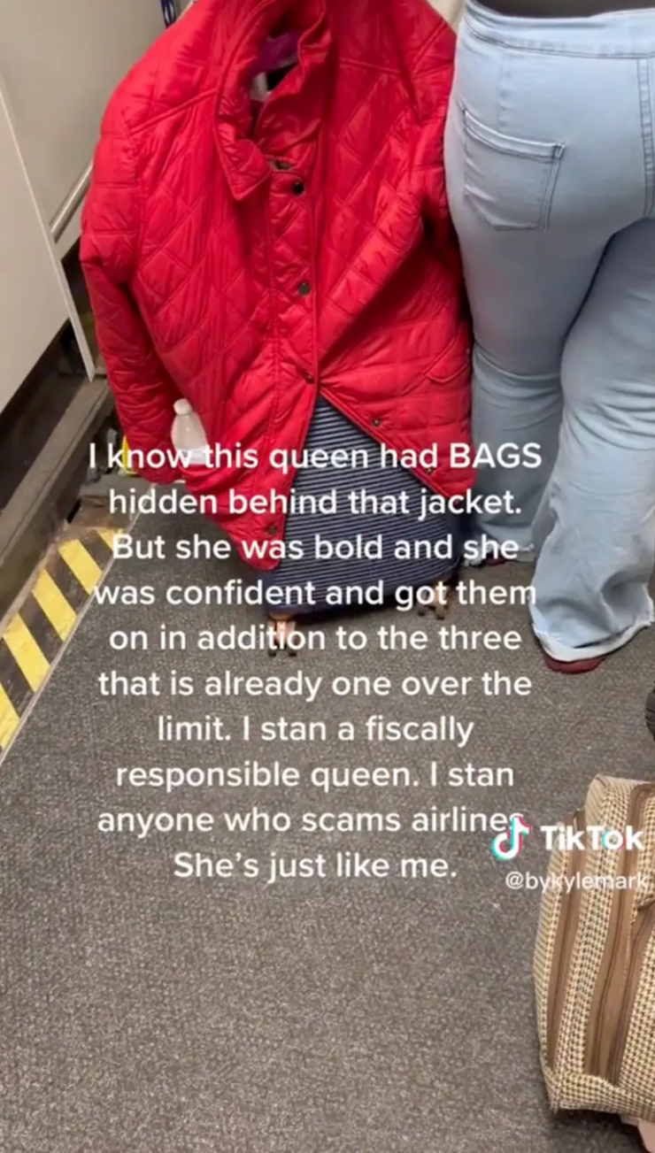 "Я знаю, что эта королева прячет чемодан за курткой. Но она смелая, ведь она уверена в себе. Добавила его к тем трем сумкам, которые уже везет собой, чем превысила лимит.
