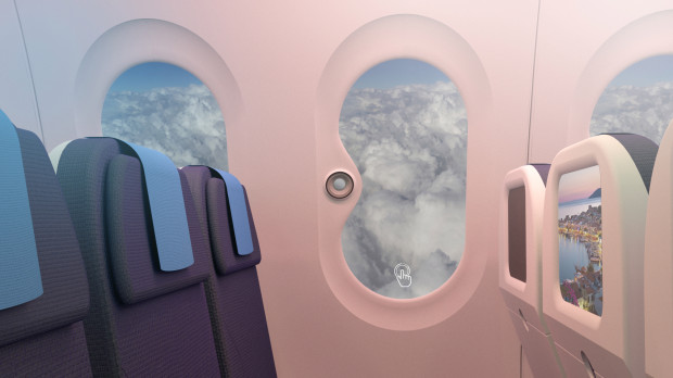 6. Среди других проектов для самолета будущего цифровые иллюминаторы, где пассажиры могут видеть любые изображения, подаваемые на них с камер, а также могут глянуть на настоящий вид из окна, отключив кнопку.