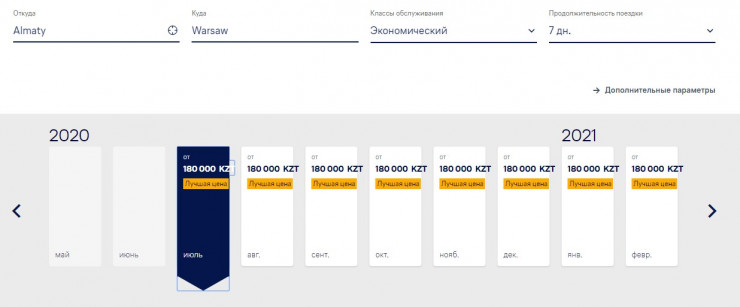 По зарубежным направлениям с июня 2020 года предлагает свои билеты и национальный перевозчик "Эйр Астана". Стоимость билетов начинается от 180 000 тенге.