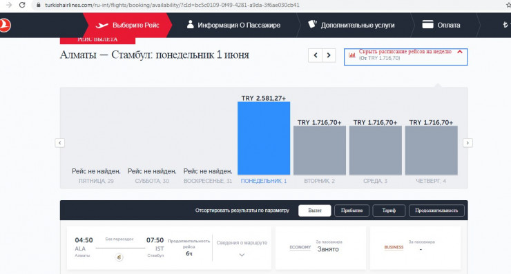 Turkish Airlines продает билеты по маршруту Алматы - Стамбул и обратно с 1 июня. Рейсы Анталья - Алматы начинаются с 31 мая, обратно можно вылететь с 1 июня. На некоторые рейсы билеты уже распроданы.