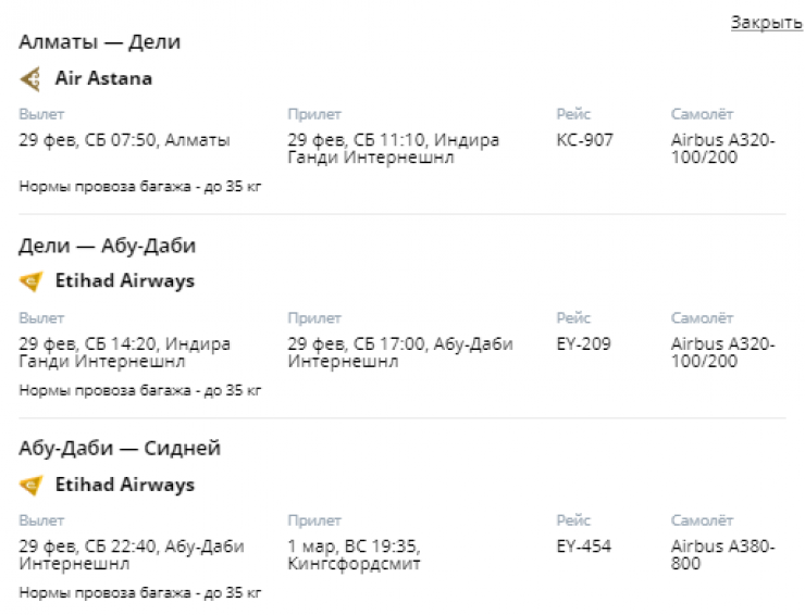 К примеру, казахстанцы могут улететь в Сидней на лайнере А 380 компании Etihad. Стоимость билета эконом-класса составит около 950 тысяч тенге. Разумеется, из Казахстана им предстоит лететь в Дели и потом в Абу-Даби на Airbus A320 или A321. А уже в Абу-Даби пассажиры смогут попасть на борт A380, который доставит их в Сидней.