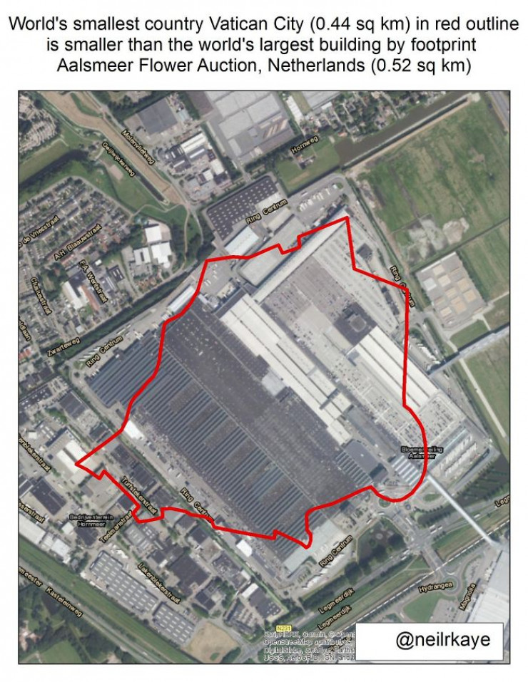 Что называется, поразитесь сравнением масштабов. Контуры Ватикана, наложенные на крупнейшее здание в мире в Нидерландах - цветочный аукцион.