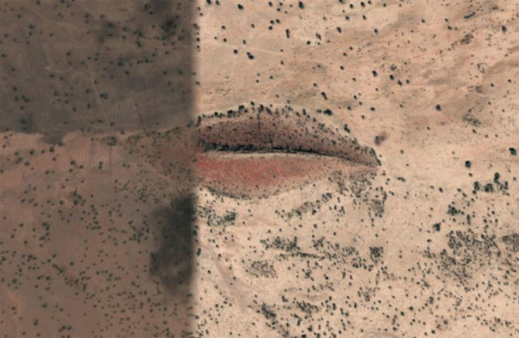 Губы пустыни, Судан. Эта фигура с губами была замечена недалеко от деревни Аравала в Западном Дарфуре, Судан. Неизвестно, что вызвало образование, но оно очень напоминает строение человеческого тела.