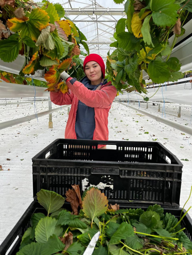 29-летняя жительница Алматинской области из села Узынагаш Арай Касым вместе с мужем отправилась на заработки на ферму в Англию, они получили рабочую визу и уже несколько месяцев собирают клубнику в поле.