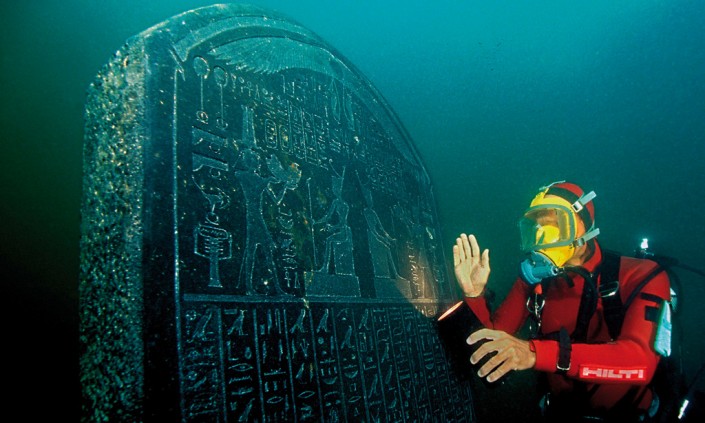 Гераклион, Египет. Этот древний город считался вратами Египта и находился в 25 километрах к востоку от Александрии. Гераклион был обнаружен одним из самых знаменитых археологов подводного мира Франком Годдио в 2000–2001 годах. Совместно с археологами Франции, Америки и Египта Франком Годдио были проведены подводные археологические раскопки, шесть лет провели археологи, исследуя воды бухты Абукир. И лишь летом 2012 года Франк Годдио объявил, что он обнаружил останки города, которые, по его мнению, относятся к Гераклиону, им была найдена черная гранитная плита, на которой было высечено "Гераклион".