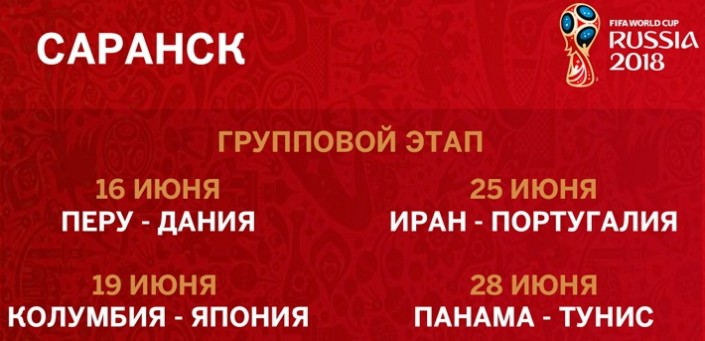 Во время мундиаля Саранск примет матчи группового этапа Перу - Дания, Колумбия - Япония, Иран - Португалия и Панама - Тунис. Максимальная вместимость арены во время ЧМ-2018 составит 44,5 тысячи зрителей.