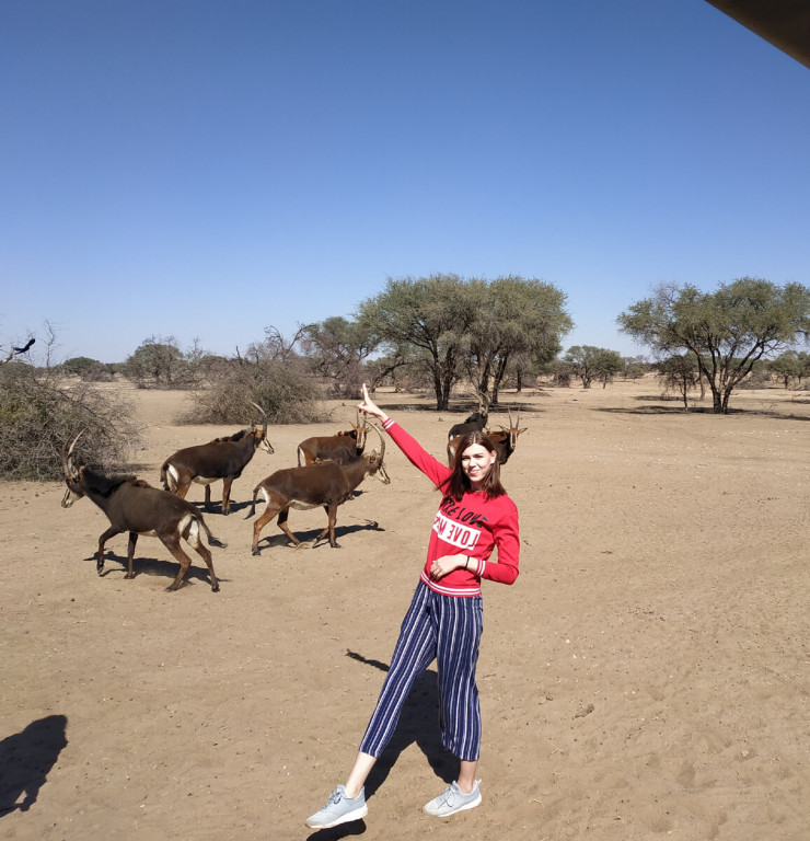На второй день мы отправились на сафари. Пейзажи прям как из мультфильмов - все совпало. Нам повезло увидеть разгуливающих жирафов, дерущихся за еду бородавочников, грациозных, но опасных страусов, носорогов и потусить рядом с антилопами и овечками. Зебры и львы где-то притаились. Было моментами страшновато, когда страусы могли и клюнуть, так как машина открыта, а они в сантиметрах от нас, да и носороги с виду не совсем добряки. Кстати, выяснилось, что казахстанцам для посещения Намибии не нужна виза, и мне захотелось когда-нибудь привезти сюда своих родных.