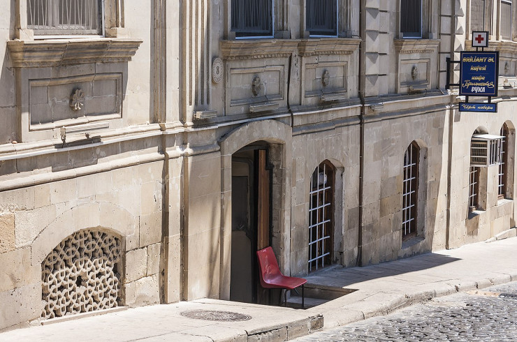 Место в Ичери-шехере в Баку, где была "аптека", у которой Горбунков падает с криком "Черт побери!", с памятной вывеской о съемках, фото с сайта ru.wikipedia.org