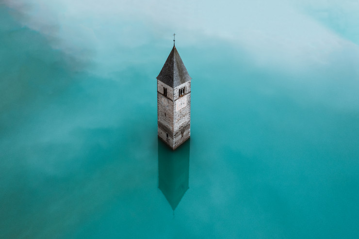 Фотограф запечатлел церковную башню в Италии, выступающую из водоема.