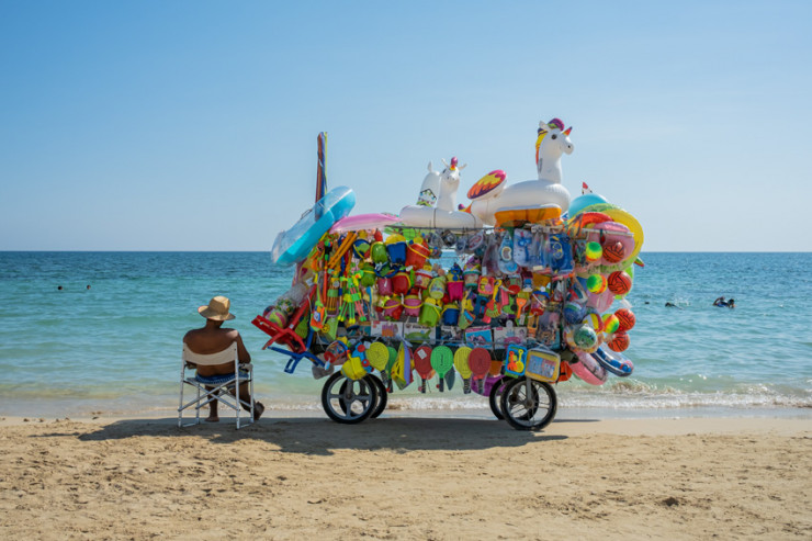 Пляжный продавец со своим актуальным прилавком в Апулии с ярким разнообразием красок.