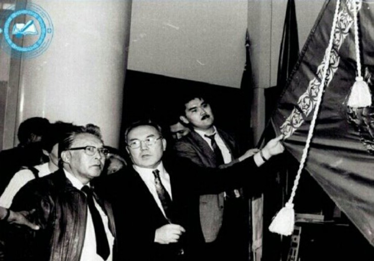 Шакен Ниязбеков и Нурсултан Назарбаев в первые минуты утверждения государственного флага. ©ЦГА РК