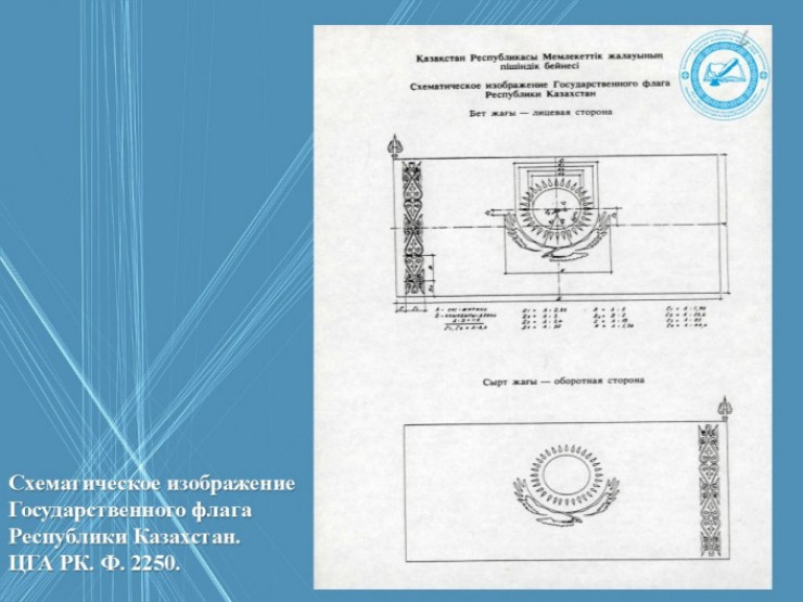Голубой флаг с золотистым национальным орнаментом слева, золотистым солнцем и силуэтом парящего орла в центре является символом свободы, независимости и суверенитета нашей республики. Этот символ – результат творческих исканий, самоотверженного труда художника Шакена Ниязбекова. Он также является автором герба Алматы.