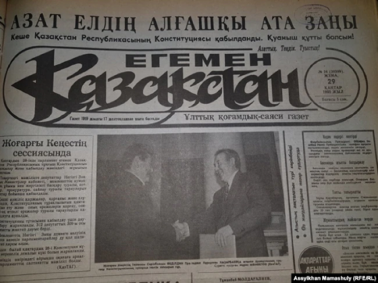 Номер газеты "Егемен Қазақстан", в котором сообщается о принятии первой Конституции Казахстана. Фото Асылхана Мамашулы.