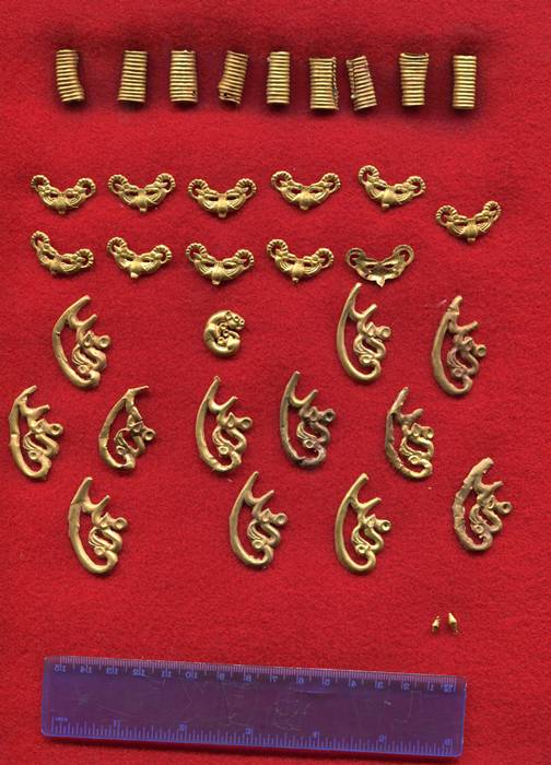 Количество находок в них также отличалось: так, два кургана и вовсе оказались пустыми, зато в других было найдено в общей сложности более 200 крупных золотых изделий в знаменитом сакском зверином стиле и более 34 тысяч мелких - и это несмотря на то, что на курганы неоднократно совершались набеги.