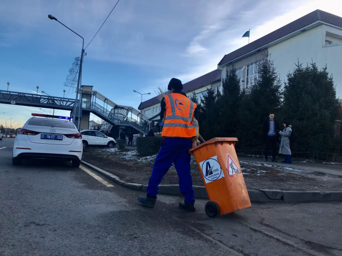 Обычное утро в Алматы. Улица Шаляпина. Пробки, несколько патрульных машин и около десятка работающих дворников у школы под номером 176.