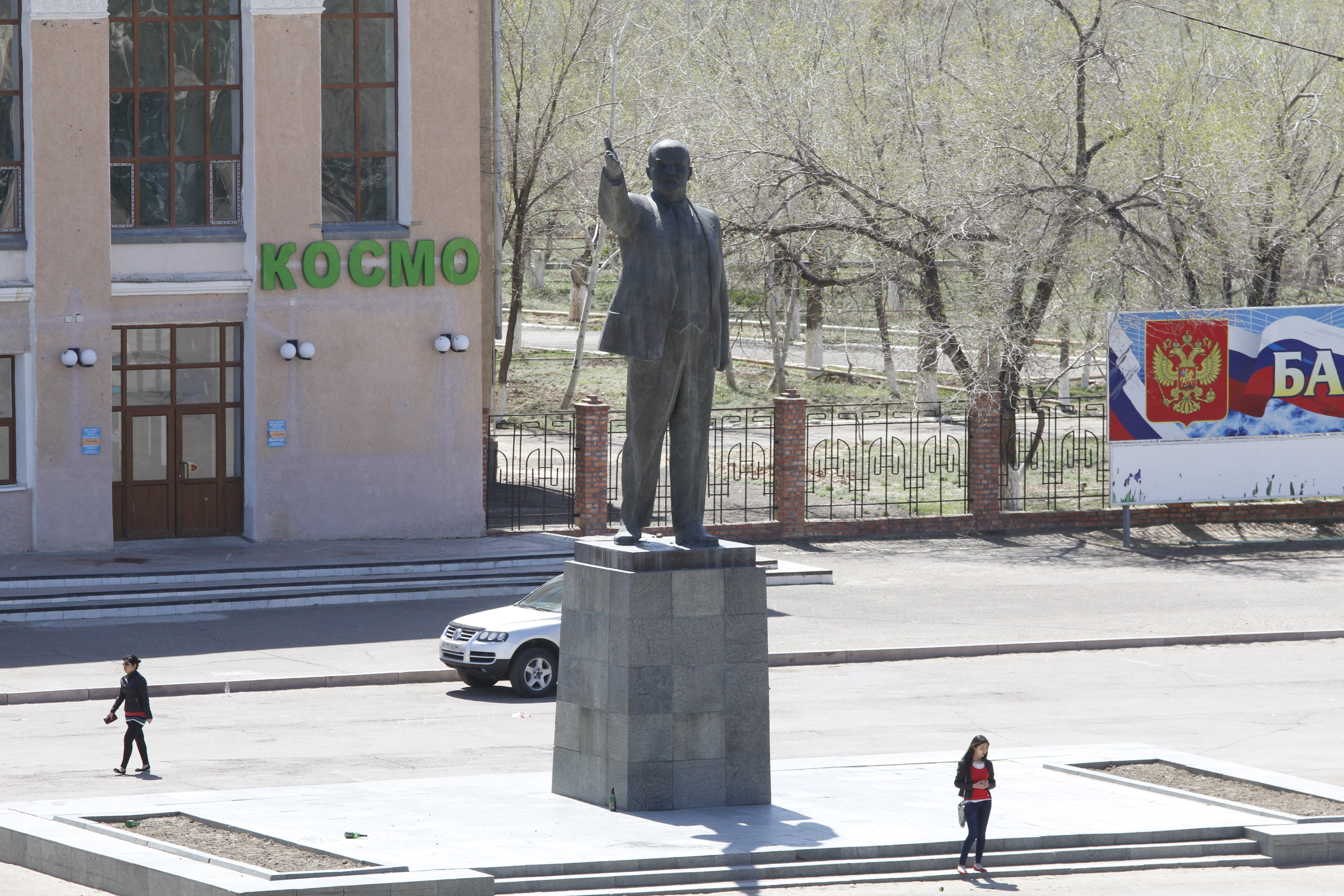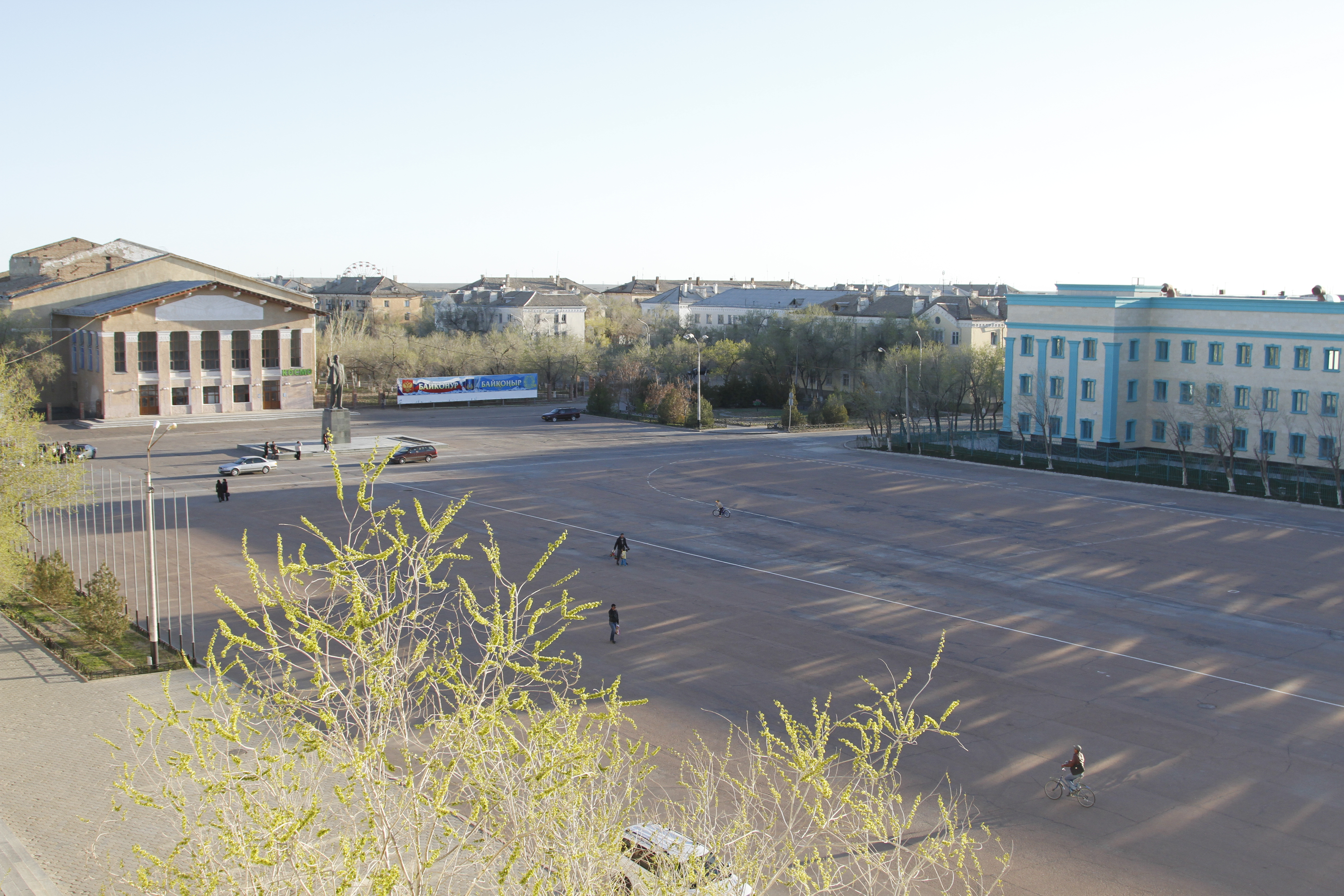 Гостиница "Центральная", как мы поняли, в городе единственная, то есть существует на правах монополии еще с советских времен. На завтрак, кстати, предлагается не традиционный шведский стол, а молочная каша и макароны. Расположена гостиница на центральной площади Байконура, напротив здания Роскосмоса, возле памятника Ленину (кстати, до 1995 года город назывался Ленинск). Причем вождь мирового пролетариата запечатлен в характерной позе с вытянутой рукой, указывающей на гостиницу. То есть, если вы ищете "Центральную", Ленин вам с удовольствием поможет, его памятник как бы говорит: "Гостиница - там!". К слову, когда я выложил фотографию площади в Интернет, одним из первых пришел следующий комментарий: "Северная Корея какая-то". Хорошо сохранившееся советское прошлое местами действительно напоминает современные социалистические страны, но эти ассоциации пропадают после первой прогулки по городу.