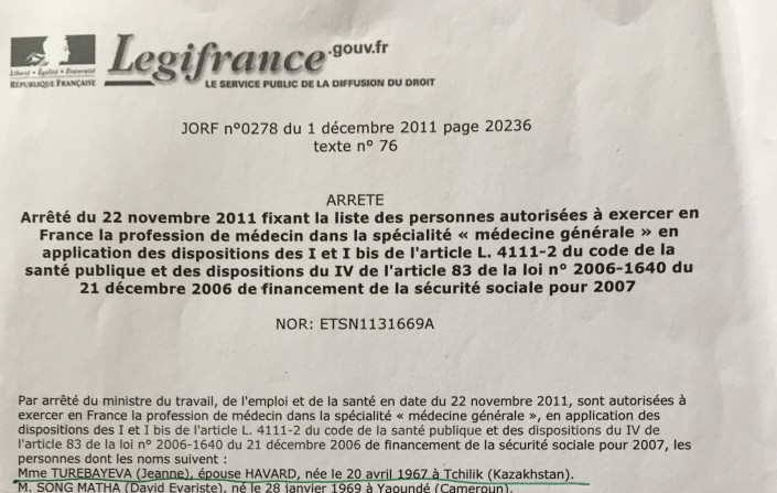 На нижнем фото - местное издание "Закон Франции". Благодаря отличной защите докторской диссертации и высшему баллу, Туребаева стоит первой в списке иностранных докторов, которым разрешили практиковать и работать с больными во Франции.