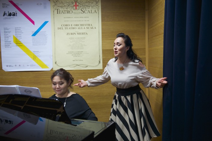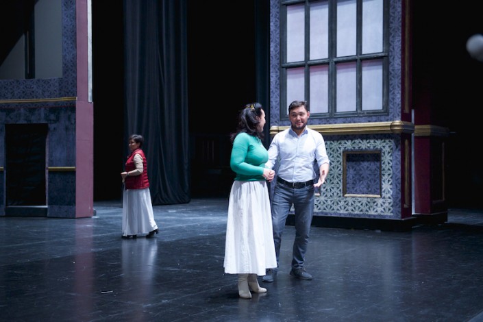 А сцену дуэли уже репетируют в зале. Онегин и Ленский отсчитывают шаги и целятся друг в друга. Партию Онегина готовят Алексей Исаев (Россия) и Талгат Мусабаев. Талгат рассказывает, что в 24 года он впервые исполнил эту роль в Большом театре России.