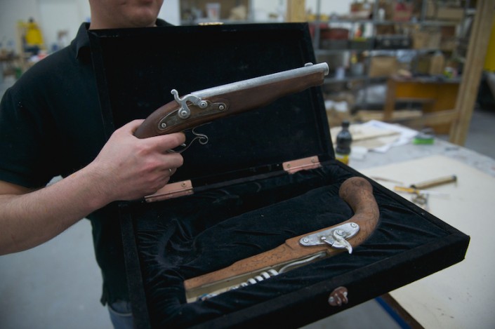 Женщины-мастера создают романтичные веера с кружевной отделкой, дамские сумочки, корзины для вязания, бокалы из пластика, которые совсем нельзя отличить от хрустальных. Мужчины-бутафоры делают канделябры, курительные трубки, трости, подносы, кулоны для часов и, конечно, револьверы для дуэли…