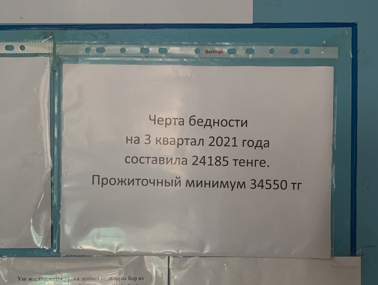 В местном центре занятости я увидел объявление, там говорилось, что черта бедности на третий квартал 2021 года составляет 24 185 тенге, а прожиточный минимум - 34 550.