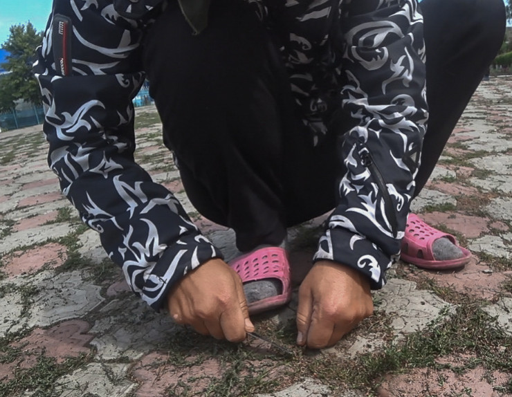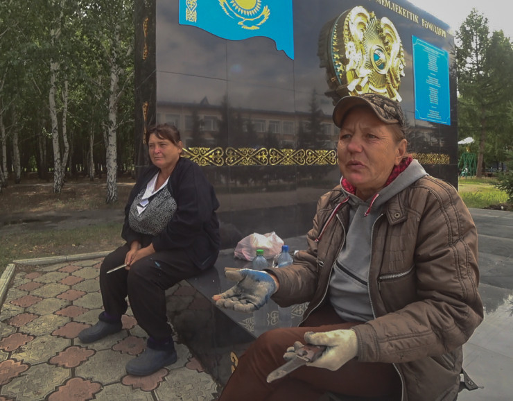 Северный Казахстан. Город Мамлютка. На площади возле государственных символов женщины с ножами в руках выковыривают из-под плитки прорастающую траву. Их работа оценивается в сорок две с половиной тысячи тенге. Со всеми вычетами они получают еще меньше - порядка 37 000.