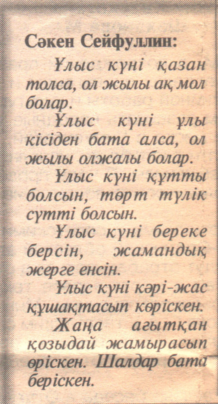 "По казахскому народному календарю начало года, 22 марта, отмечалось народом как праздник весеннего равноденствия - Наурыз той, - продолжает Жамбыл Жумабеков. - Этот праздник соответствует иранскому новому году Новруз. Во многих странах, регионах Центральной и Передней Азии он отмечается с древнейших времен как наступление нового года. В этот день люди веселились, желали добра друг другу, обнимались, пели песни, которые издавна были сложены специально для этого праздника, так называемый Наурыз жар.