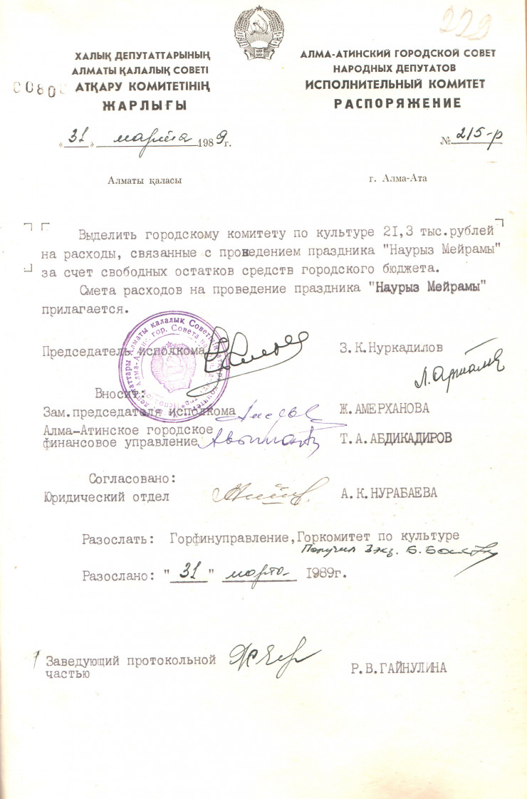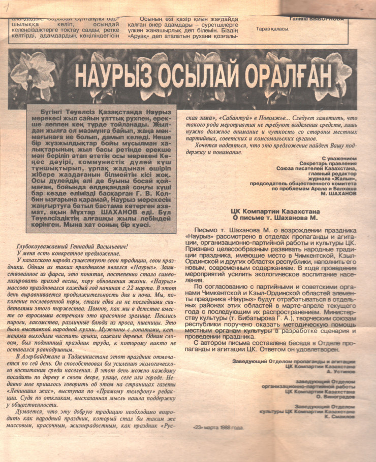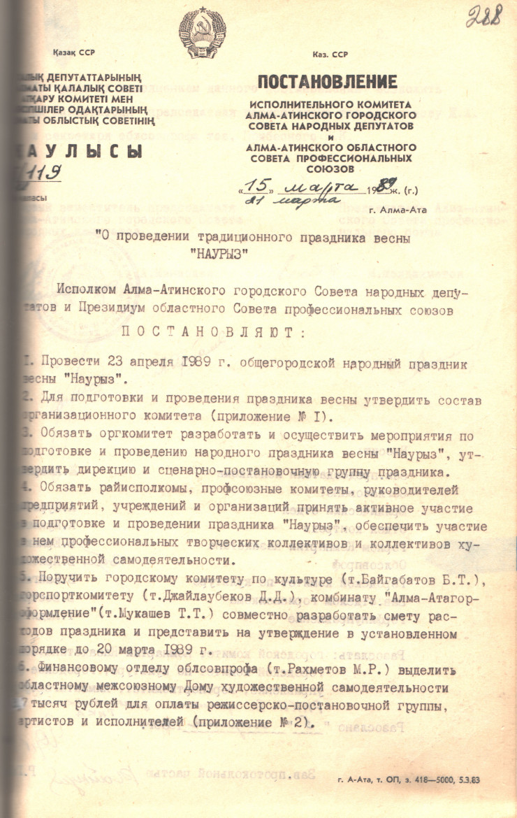 По материалам Государственного архива Алматы, в 1988 году к Первому секретарю ЦК Компартии Казахстана Геннадию Колбину поступило обращение с просьбой возродить традиции, и с этого года все меняется.