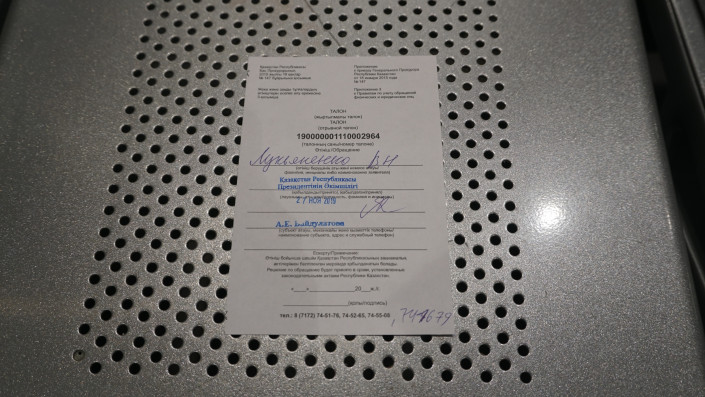Он говорит, что в сентябре был на приеме у помощника президента. На этот раз они хотели еще раз с кем-нибудь встретиться в Акорде. Но приехали без предварительной записи. В итоге смогли лишь сдать свое заявление на имя Касым-Жомарта Токаева, в подтверждение чего получили талон.