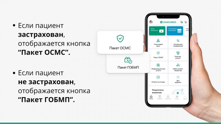 Далеко не все имеют возможность найти необходимую в данный момент времени информацию о системе ОСМС или вообще не знают, на каких ресурсах ее нужно искать. В приложении Damumed вся необходимая информация под рукой. Помимо большого спектра полезных медицинских сервисов, приложение подскажет, какие медицинские услуги может получить пациент, в зависимости от своего статуса застрахованности. Для этого каждый пациент видит у себя в приложении кнопку "Пакет ОСМС" или "Пакет ГОБМП". Также на главной странице можно посмотреть свой актуальный статус, благодаря интеграции с системой Фонда ОСМС Saqtandyrý.